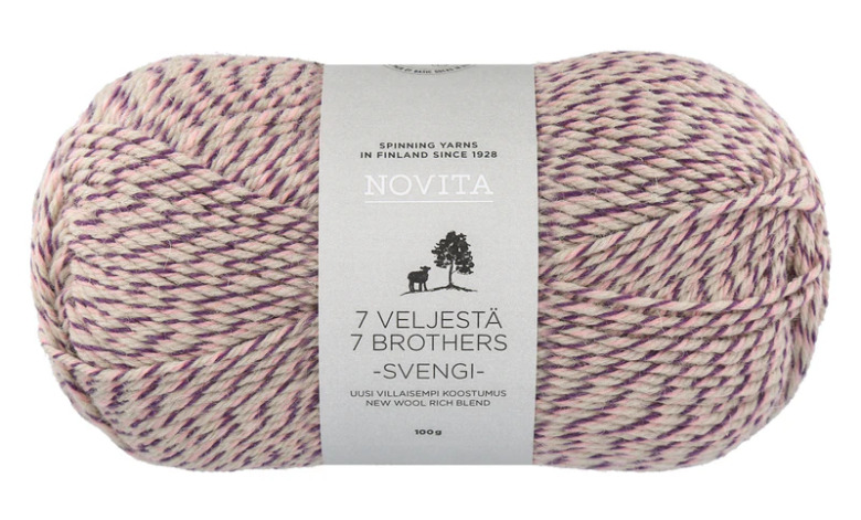 Novita 7 bröder Svengi är en svängig nykomling i den älskade 7 bröder-familjen. Garnet har trådar av olika färger som gör den stickade ytan levande och jämnt flerfärgad. 7 Veljestä Svengi består av 80 % värmande ull och 20 % polyamid som gör garnet mer hållbart. Tack vare garnets sammansättning och bra tvinning passar det utmärkt till stickade plagg och accessoarer samt kan användas som sockgarn. Prova också att kombinera Novita 7 Veljestä Svengi med enfärgade 7 bröder-garn. Ett nystan räcker till vanliga sockor i storlek 38. Garnet kan tvättas i maskin i 40 grader. Stickrekommendation 4, till sockor 3,5. I ett nystan pa? 100 gram finns 200 meter garn. Novita 7 bröder är en Nyckelflaggsprodukt.